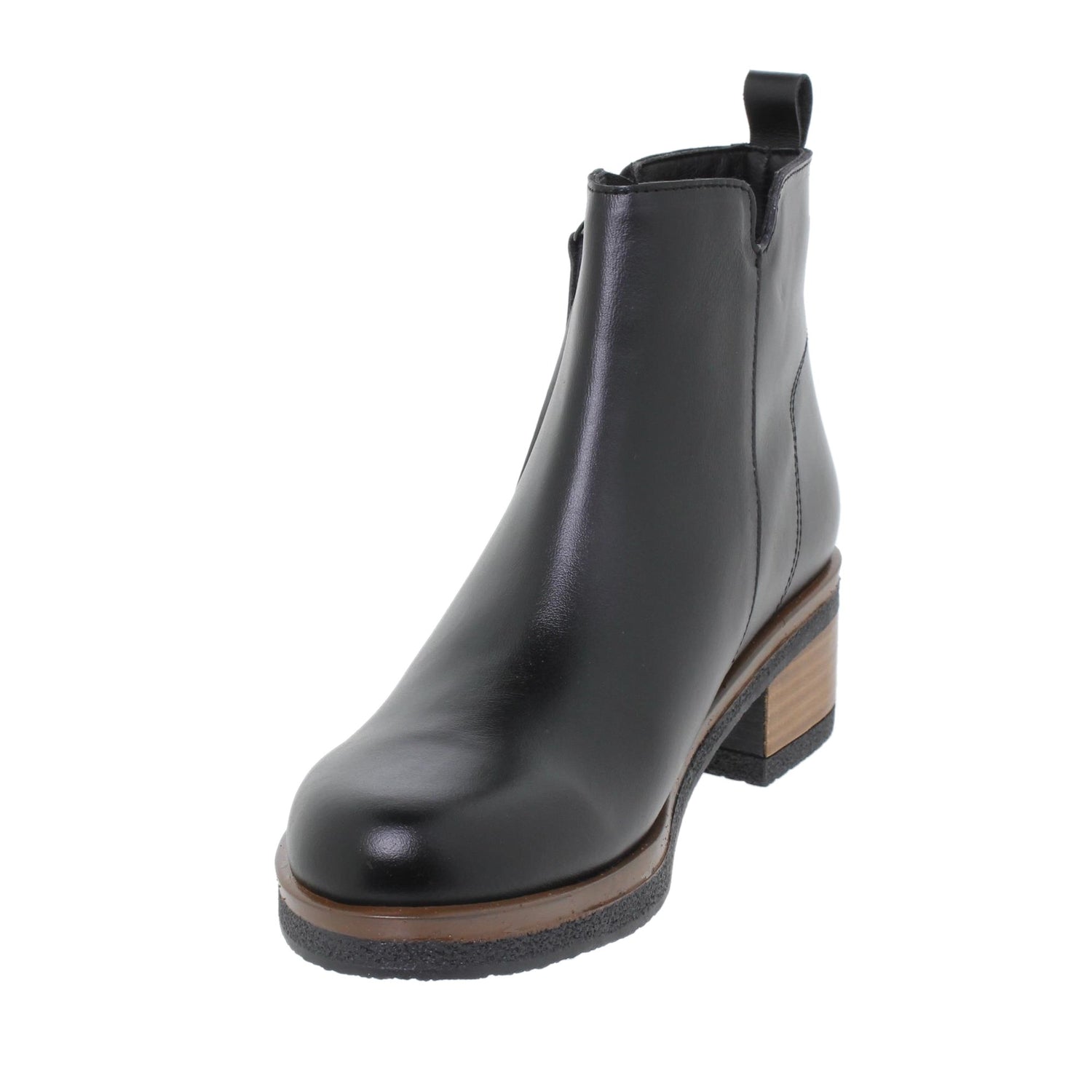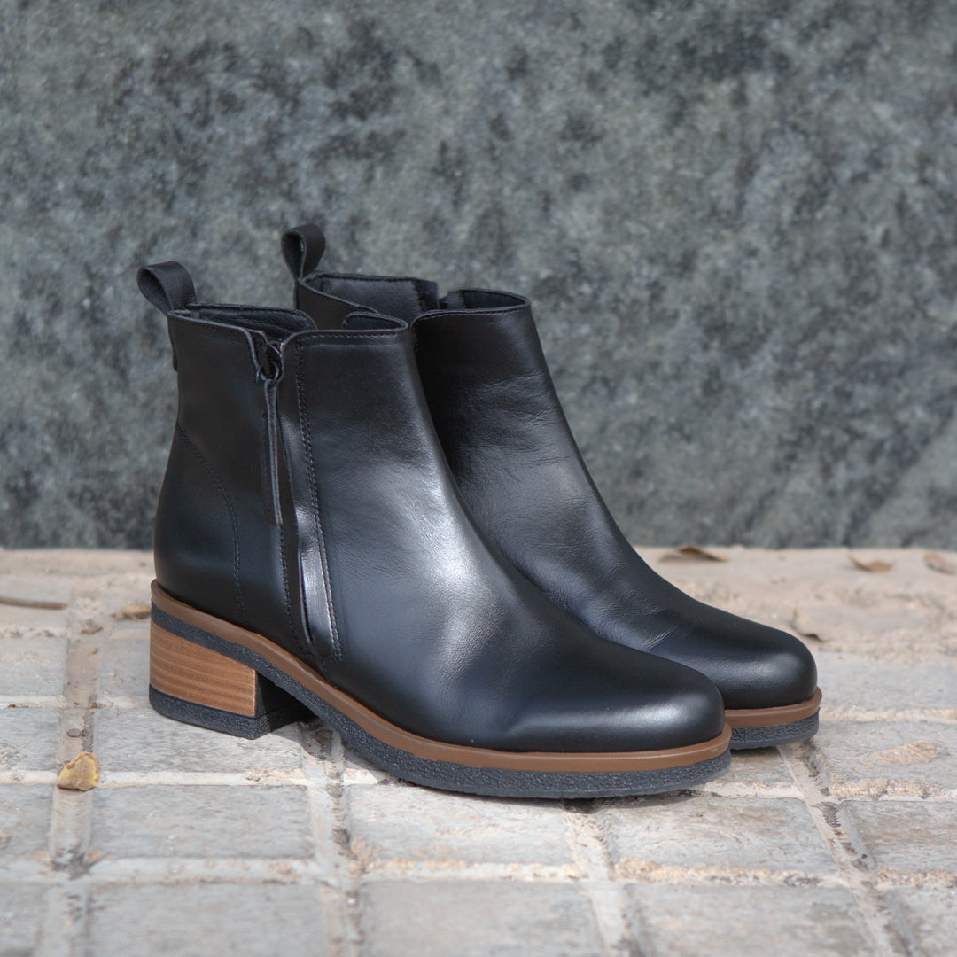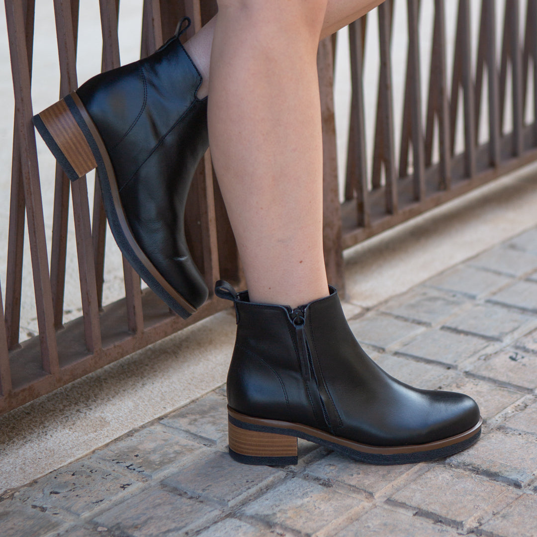 Botines de mujer negro cuero, en piel, con un tacón muy bajo. Botines ideales y en tendencia para esta temporada otoño/invierno