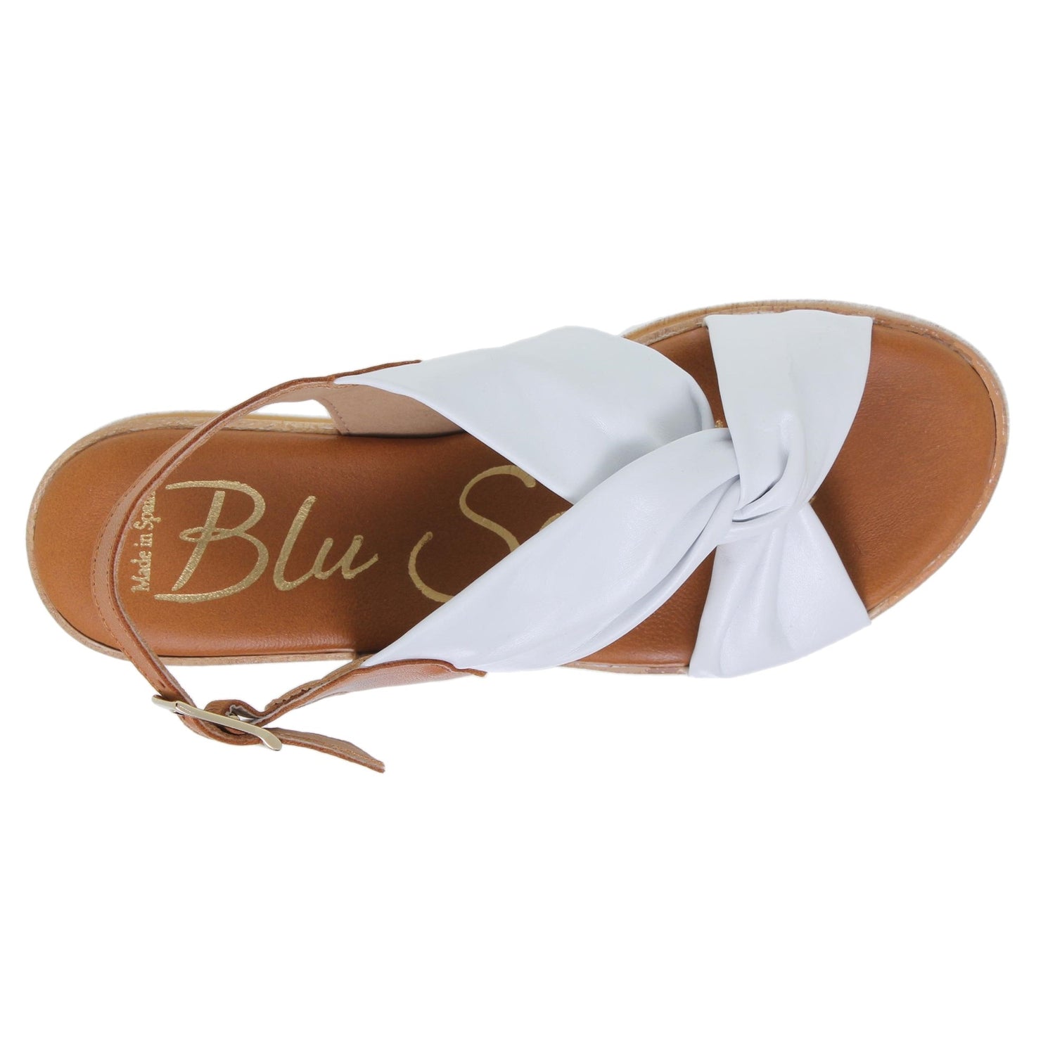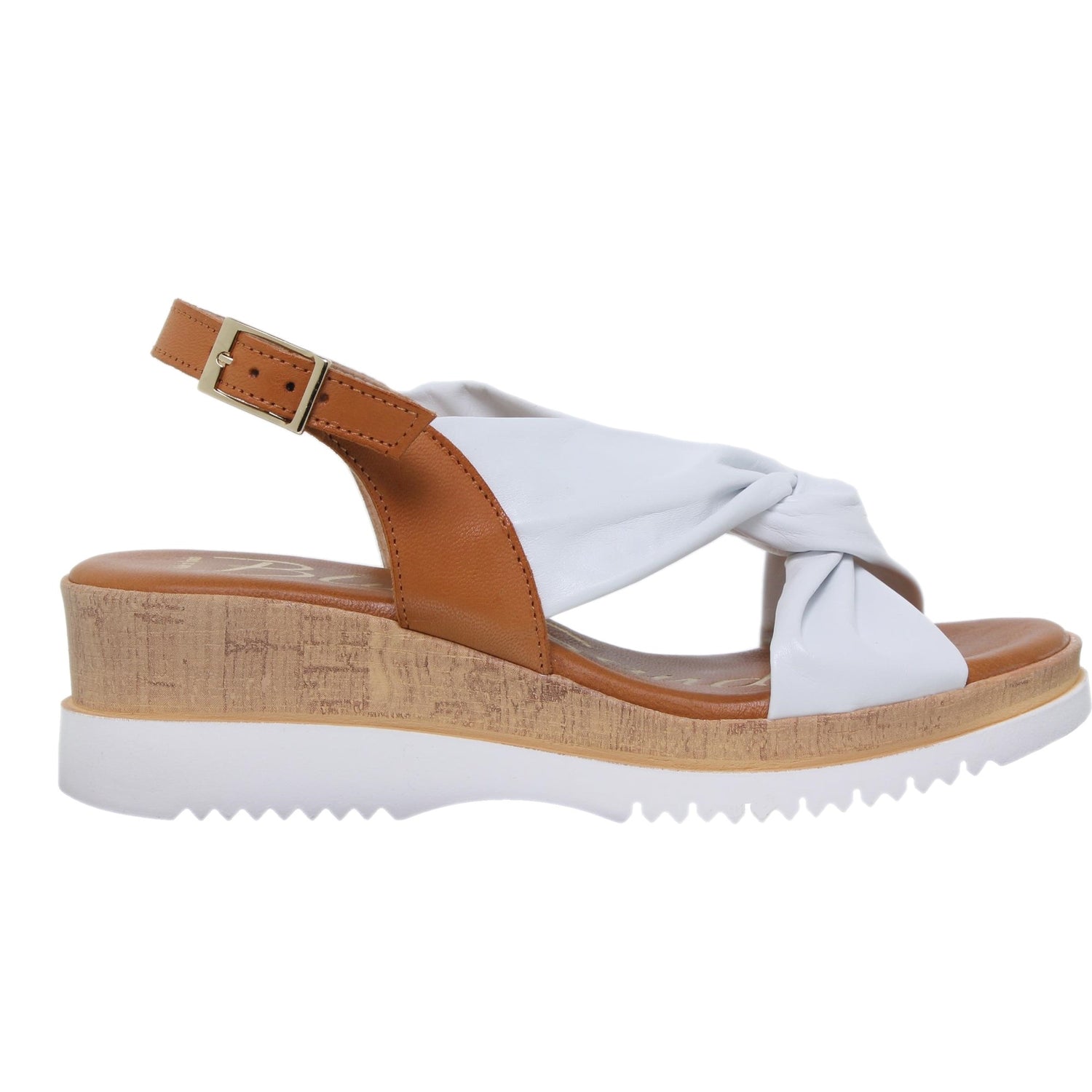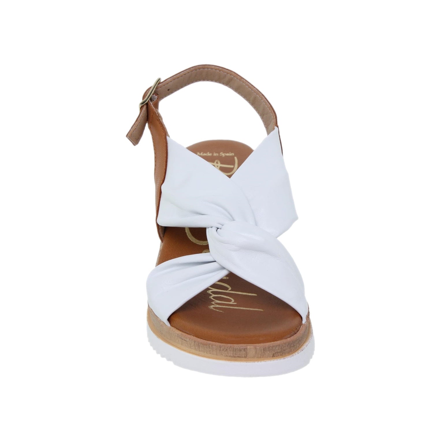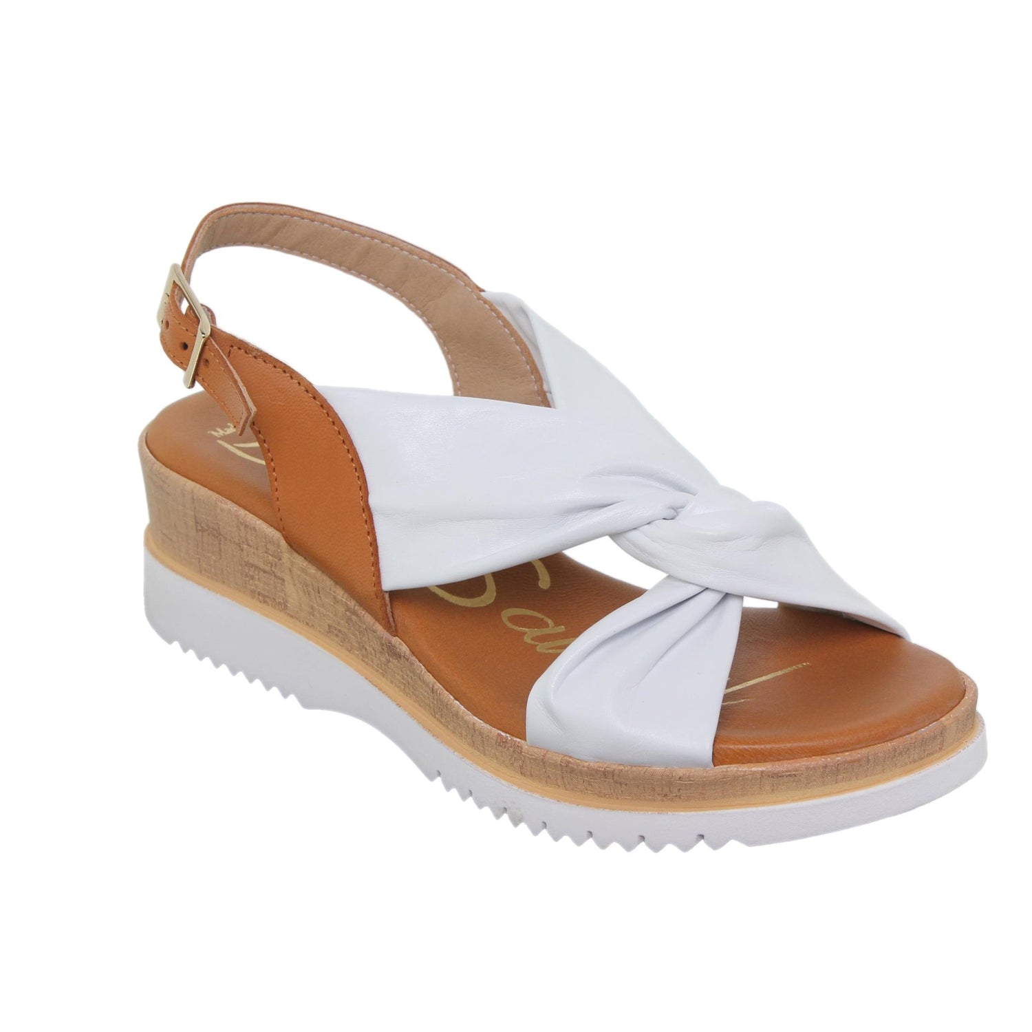 Sandalias cuña de piel para mujer con original diseño de pala con nudo y cierre de hebilla al tobillo. Su plantilla de piel con gel aporta un extra confort. ¡No te las querrás quitar!