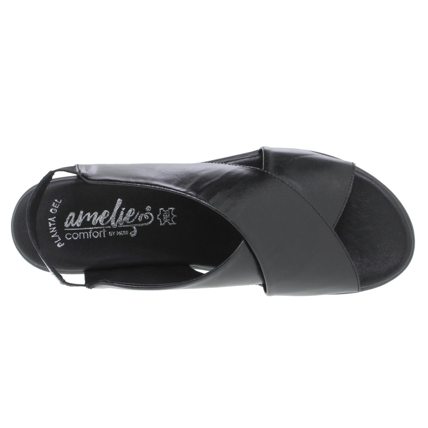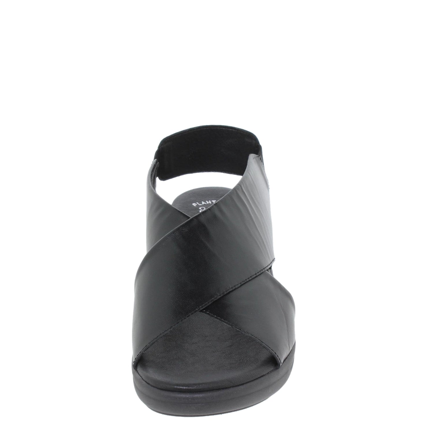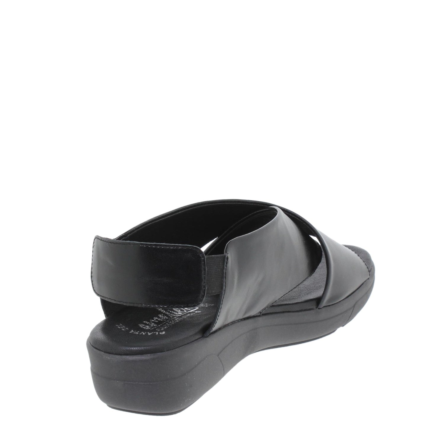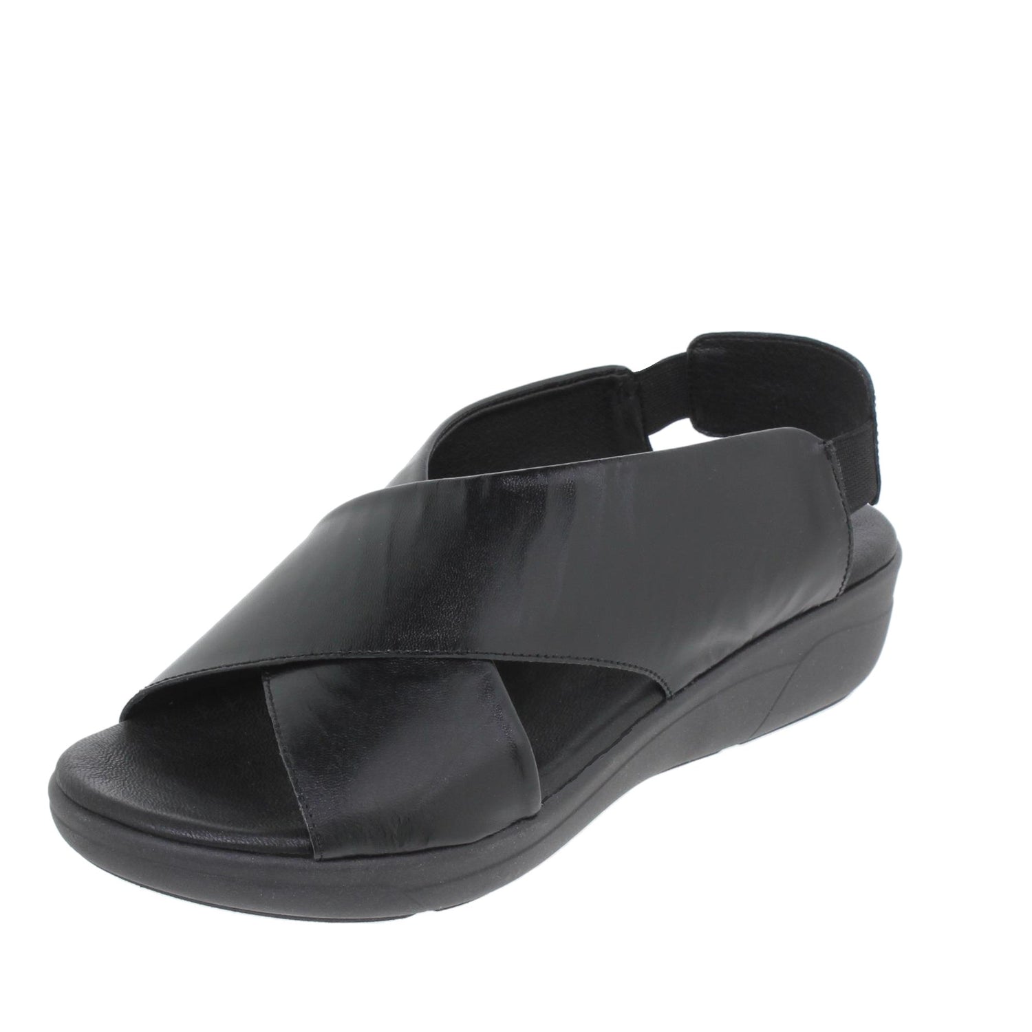 Sandalias cuña bajita de mujer en piel negro, con diseño tiras anchas cruzadas y sujeción elástica al tobillo. Líneas sencillas pero muy estilosas, fáciles de combinar en nuestro día a día.