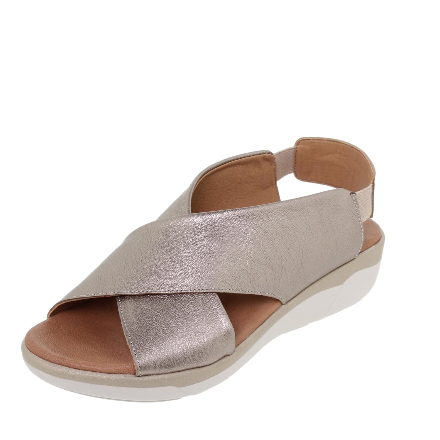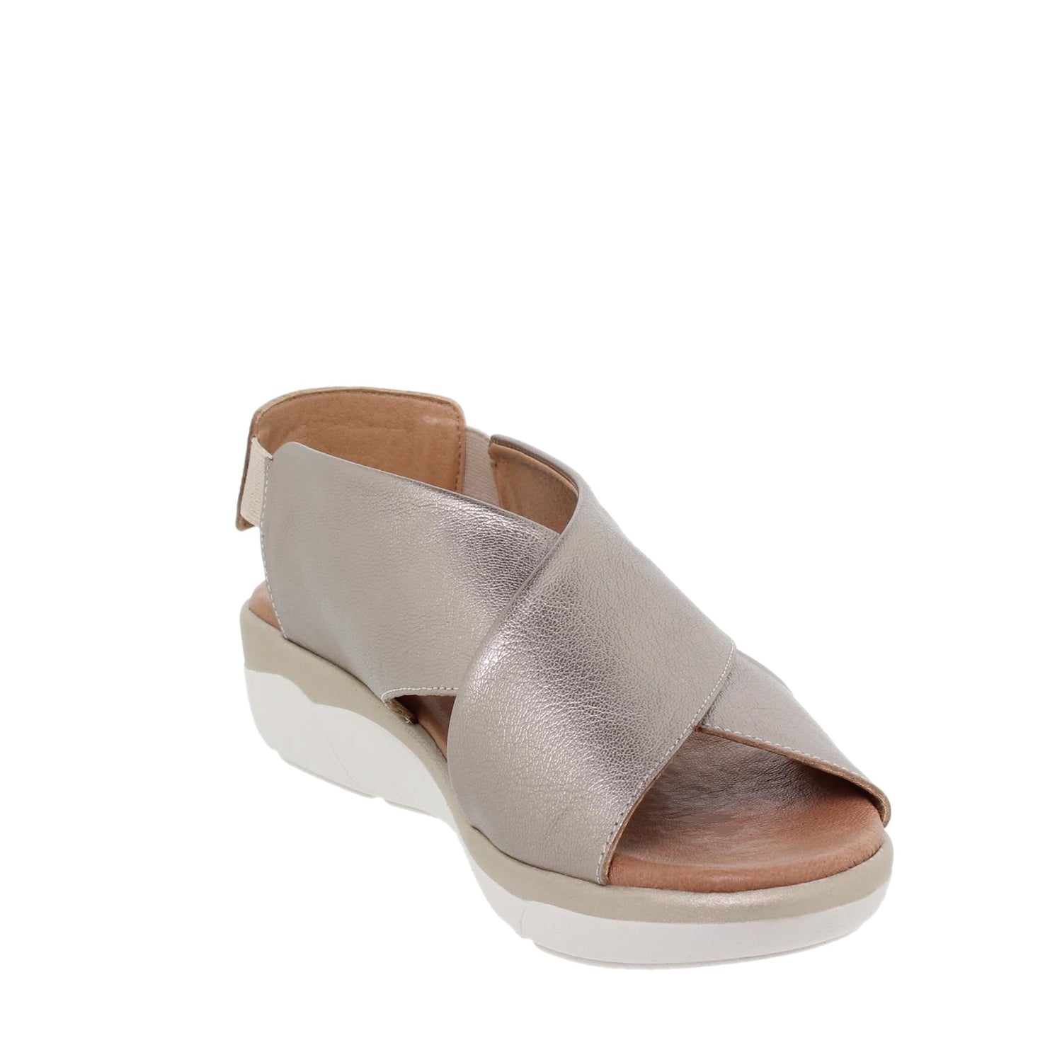 Sandalias cuña bajita de mujer en piel oro, con diseño tiras anchas cruzadas y sujeción elástica al tobillo. Líneas sencillas pero muy estilosas, fáciles de combinar en nuestro día a día.